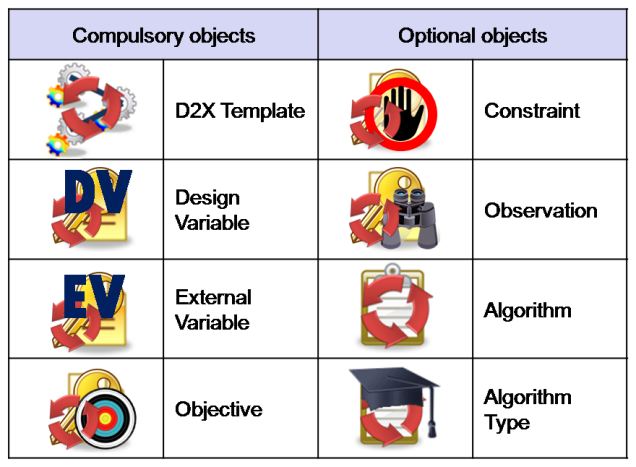 The Business Objects for Optimisation allow the definition of the intent of an optimisation, i.e what are the variables and the objective. Additionally it can also define constraints, observations and the algorithm to be used in the optimisation. The elements all have a prefix of D2X or “Design to X”.